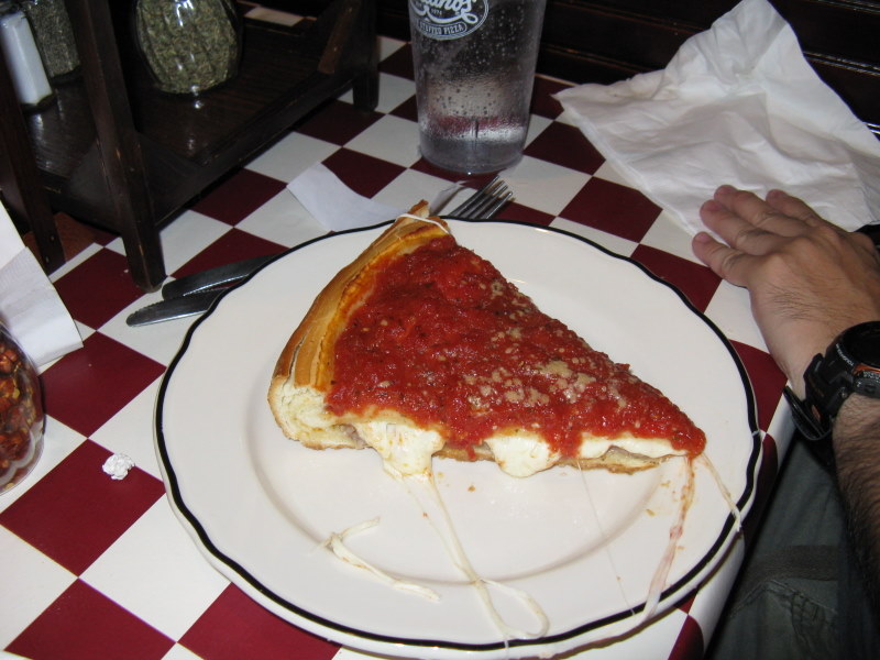 I will probably be doing about six posts about Chicago, because honestly there are many pictures and a whole lot of words that I want to share about my trip. I have sort of come up with some catagories and the thing that I wanted to start with is the food in Chicago, because that is supposedly one of those famous things that you have to do when you go to Chicago. What it comes down to is three things. You have to try the Chicago deep dish pizza, which I am sure a great many people have heard about. I certainly was aware of that before I left. The other two I was less familiar with. There is a Chicago hotdog and an Italian beef sandwich.