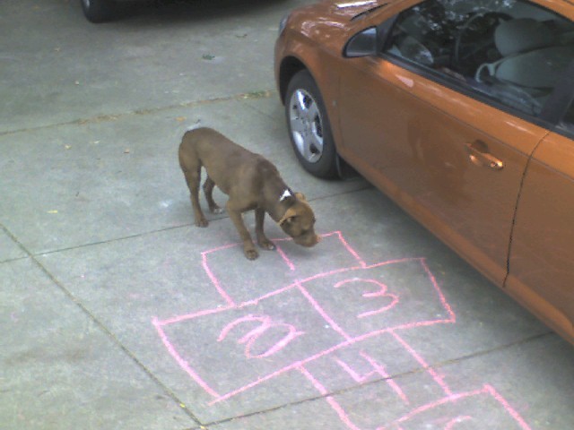 Grandma called the police who showed up and tried coaxing the dog into the car. My Grandma kept calling this dog a pit bull. I don’t know if it is or not, but it doesn’t look like it. I don’t know that much about dogs though. The owner drove past just in time to claim his dog and so this story has sort of a happy ending. I hope he takes better care of his dog this time.
